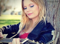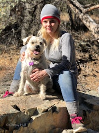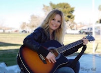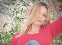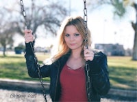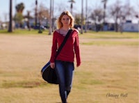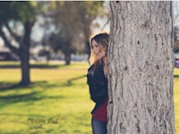 a woman is sitting at a picnic table