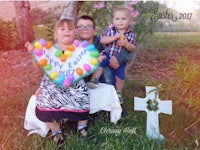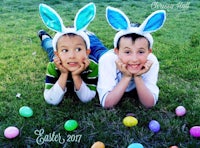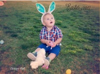 a young boy wearing an easter hat and bunny ears